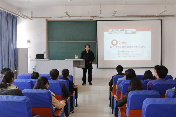 北京玻钢院复合材料有限公司(北京玻璃钢研究设计院,原北京二五一厂),隶属于中国建材集团有限公司,在复合材料设计、研发、制造方面具有雄厚实力,是国内复合材料集设计、研发、生产、检测、评价为一体的大型综合性机构。田谋锋处长首先向师生介绍了北玻院的发展历程,接着深入分析了高性能酚醛树脂国内外的研究发展现状,然后就航天用高性能酚醛树脂的研制与复材成型工艺展开论述,最后展望了各类树脂的应用前景。报告结束后,田谋锋处长就参会师生提出的问题认真进行回答,并提出了合理建议。
