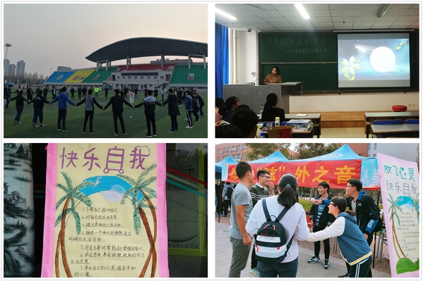心理知识展板以《放飞心灵,快乐自我》为主题,帮助同学们了解自己的心灵,放松自己的身心,保持积极向上的心理状态。心理电影展播以《国王的演讲》为首播,这部电影中人物的情绪改变非常贴近我们的生活,每个人都能从中看到自己因某一方面自卑时的心理感受,通过触动内心深处的灵魂来励志自己的生活和学习。“悠悠‘弦’外之音”以游戏的方式让大家两两参与其中,同学们在活动中相互理解,相互配合,齐心协力,收获了喜悦,收获了友情;本活动在心理嘉年华现场也受到大家的一致好评。