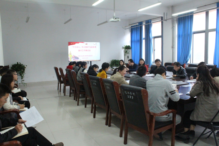 根据《中共郑州轻工业大学委员会“不忘初心、牢记使命”主题教育实施方案》要求,按照PA真人视讯游戏 “不忘初心、牢记使命”主题教育工作安排,10月15日,PA真人视讯游戏 在化工楼222会议室开展“不忘初心、牢记使命”主题教育重点工作推进会,党总支书记康国磊、副书记宋德涛、教工支部、学生支部委员参加本次会议。