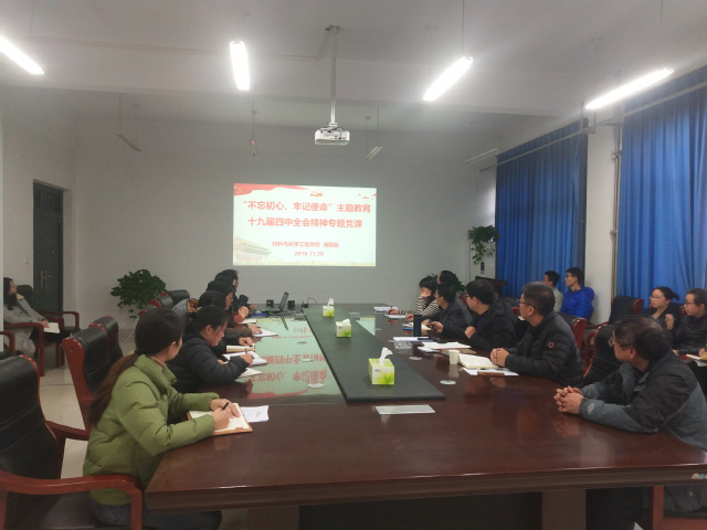 根据“不忘初心、牢记使命”主题教育工作安排,为深入学习党的十九届四中全会精神,11月28日,PA真人视讯游戏 在化工楼222召开“不忘初心、牢记使命”主题教育党的十九届四中全会精神专题党课,党总支书记康国磊、党总支副书记宋德涛、全体支部委员参加本次党课,党课由党总支书记康国磊主讲。