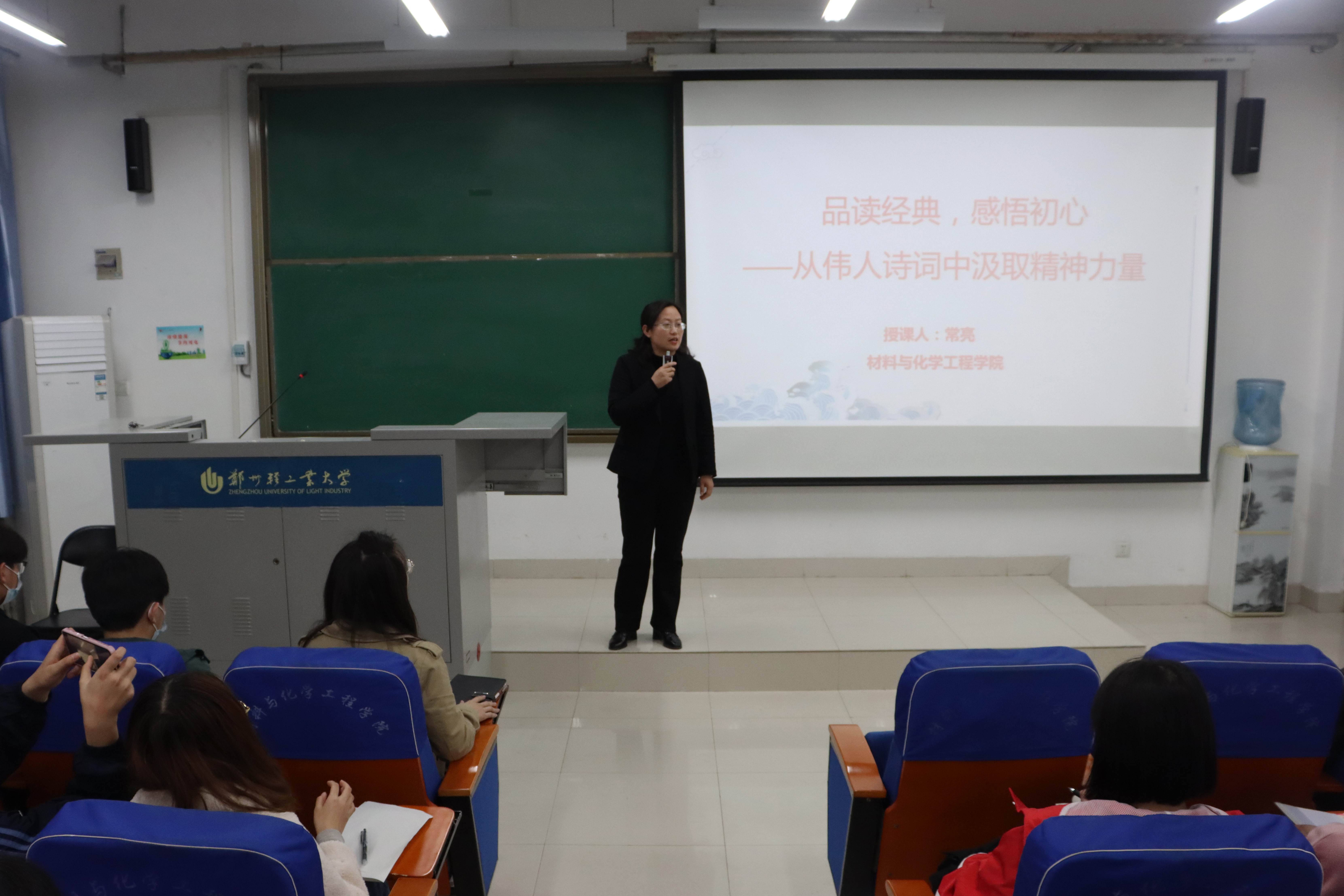 3月24日,常书记以“品读经典,感悟初心——从伟人诗词中汲取精神力量”为题,讲述了毛泽东诗词中蕴含的“学不成名誓不还”的远大抱负、“欲与天公试比高”的战斗精神、“万水千山只等闲”的乐观心态、“六亿神州尽舜尧”的人民情怀。她表示,希望同学们从伟人诗词中领略青春奋斗的智慧,从党的非凡历程中感悟中国共产党人的初心和使命,从新中国的发展史中汲取实现中国梦的磅礴伟力,从改革开放的伟大变革中树立砥砺奋进新姿态,在波澜壮阔的历史画卷中增强“四个意识”、坚定“四个自信”、做到“两个维护”。