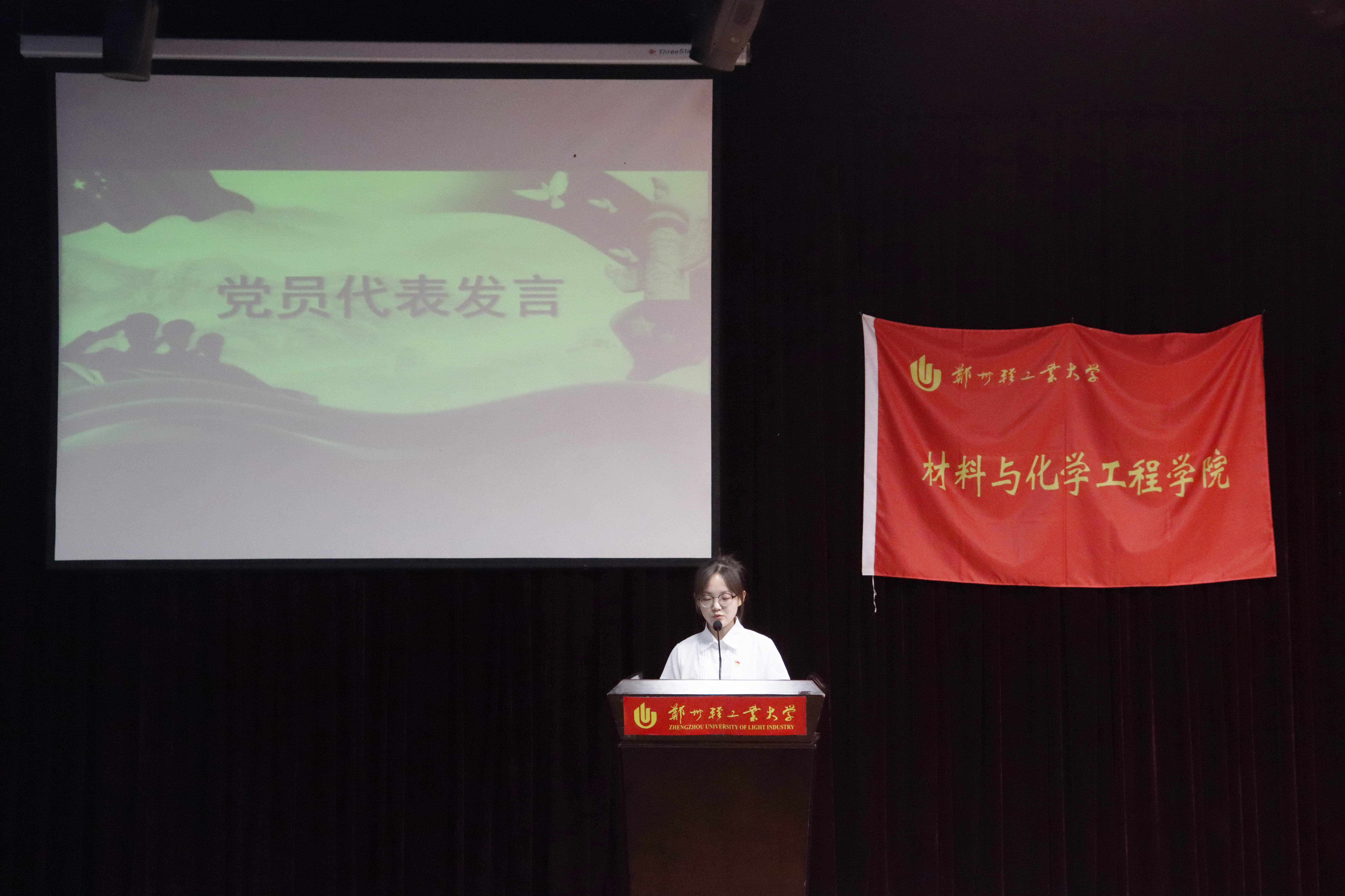 在鲜红的党旗下,庄严的国际歌声中,宣誓仪式正式开始。首先由组织员程亚芬宣读176名学生党员名单;周立明、司丽娜为党员代表佩戴党员徽章。接着,与会党员在司丽娜的领誓下,面对鲜艳的党旗,高举右拳,庄严肃穆地重温了入党誓词。铿锵恢弘的誓词,强烈震撼着在场的每一位党员,一字一句,神圣而豪迈,铮铮誓言,体现了党员同志们对中国共产党的无限忠诚,坚定了共产党人终身坚守、矢志不渝的信念。