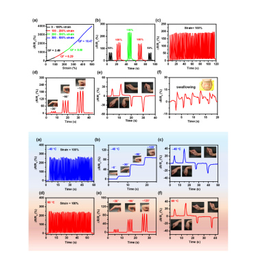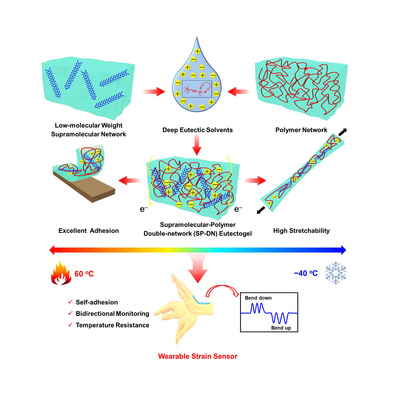 鉴于此,该研究团队在前期研究工作的基础上提出了一种低分子量超分子-聚合物双网络(SP-DN)策略,以设计制备具有优异自粘附性和宽温度耐受性的高韧性和可拉伸导电的低共熔凝胶。这种基于低分子量超分子-聚合物双网络策略来制造的具有高机械强度和韧性、快速自愈、牢固粘附和宽温度耐受性的低共熔凝胶,可用于高灵敏度和长期稳定准确的检测各种身体运动,有望成为可穿戴自粘附应变传感器的强力发展对象。此外,应变传感器在凸面和凹面皮肤表面以及不规则皮肤变形期间均显示出优异的传感性能,同时在宽温度范围(-40至60°C)内保持出色的机械柔韧性、灵敏的传感性能和良好的耐久性。考虑到低共熔凝胶的优异粘附力和应变引起的电阻变化,研究人员制造了自粘附应变传感器以证明其作为电阻型传感器的潜在应用。该工作为制造具有高环境适应性的下一代软电子设备的机械坚固和功能集成的智能材料提供了一种有前途的设计策略。