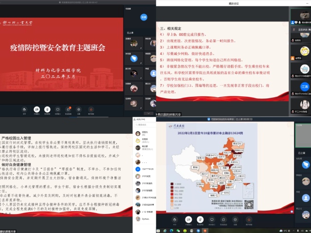 3月17日下午,各班级召开疫情防控暨安全教育线上云班会。各辅导员详细分析了近期疫情防控的严峻形势,传达了学校疫情防控工作相关精神,要求全体学生严格遵守校园疫情防控管理规定,带领同学们认真学习了《关于加强学生疫情防控的告知书》相关内容;详细介绍了班级网格化管理的方法,强调各级网格长的责任分工,要求各网格长各司其职,主动担当,认真完成任务。结合详实的案例,加强网络安全教育,提醒同学们提高警惕心,严防网络诈骗。最后,辅导员结合课程情况,引导学生科学规划学习生活,合理安排时间,强化专业技能提升。