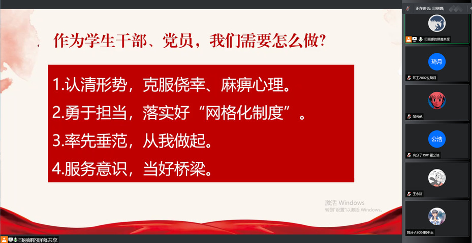 为更好地开展疫情防控工作,增强学生战胜疫情的决心,同时进一步发挥学生党员干部在疫情防控中先锋模范作用,5月5日中午,PA真人视讯游戏 通过线上召开封闭管理期间学生党员、网格长会议。真人游戏 党委副书记司丽娜主持会议,全体辅导员、学生党员、网格长参与了此次会议。