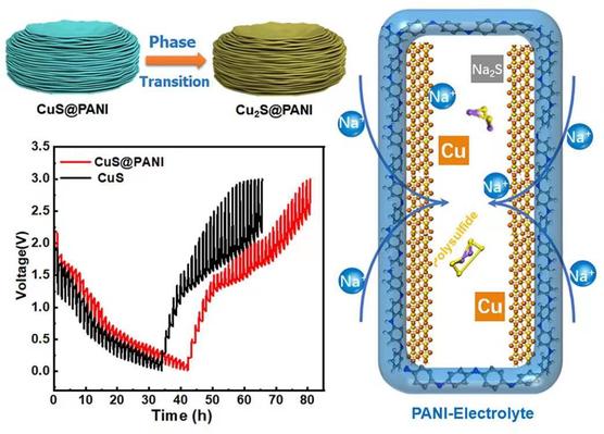 钠离子电池转化反应型金属硫化物电极材料由于内部“未反应核”,表面粉化和多硫化物穿梭效应会导致它们实际容量偏低和循环稳定性不理想。传统的材料纳米工程不易同时解决上述系列难题。鉴于此,该团队通过在CuS纳米片表面原位修饰聚苯胺 (PANI) 薄膜,提高钠离子电池的倍率与循环性能。该PANI膜具有显著优于一般碳材料的断裂伸长率,能更有效地缓冲材料的体积形变,抑制材料表面粉化。同时,该PANI膜在电解液中展现了优异的可逆溶胀性能。经溶胀的PANI可以稳定固态电解质界面相,促进载流子输运。再者,PANI中带正电荷基元(–NH2+–)能吸附电负性的多硫化物,抑制穿梭效应。