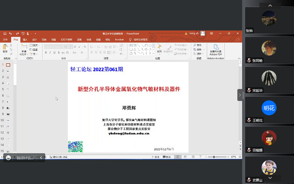 12月6日下午,应我校PA真人视讯游戏 和科技处邀请,国家杰青复旦大学邓勇辉教授线上为我校师生做“新型介孔半导体金属氧化物气敏材料及器件”及“国家自然基金撰写经验交流”学术报告,本次报告由PA真人视讯游戏 张永辉副院长主持,真人游戏 相关专业的师生参加了报告会。