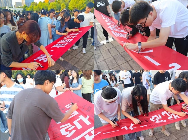 上午6时40分,国旗护卫队迈着铿锵有力的步伐,迎着初晨的微风,护送鲜艳的五星红旗走向国旗台。五星红旗伴随高亢嘹亮的《义勇军进行曲》冉冉升起,全体学生肃然屹立,向鲜艳的五星红旗行注目礼。礼毕,2022级学生代表蒋欣桐以《“勿忘国耻·砥砺奋进”纪念“九一八”事变92周年》为题做国旗下讲话,带领同学们重温“九一八”事变,提醒同学们勿忘国耻、砥砺奋进,号召同学们为中华腾飞而不断努力,为中国富强而不懈奋斗。同学们纷纷怀着满腔热血,激动地在写有“‘勿忘国耻·砥砺奋进’纪念‘九一八’事变92周年”的横幅上签上自己的姓名,表达坚定的信念与爱国之情。