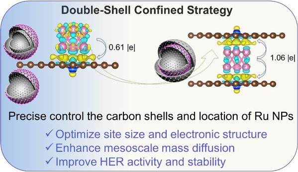 氢能是未来国家能源体系重要组成部分和实现绿色低碳转型重要载体,开发高效催化剂对突破电解水制绿氢过程中面临的高能耗瓶颈至关重要。调控活性中心周围的微环境可有效改善催化剂的电子结构和稳定性,有望实现高通量电解水产氢,然而如何精准控制活性中心的落位位置仍然具有挑战。基于此,本工作提出一种双壳层夹层限域策略,通过控制Ru纳米颗粒在介孔中空碳纳米反应器中的空间位置,调制活性位点的尺寸和电子结构,增强电化学水分解产氢活性和稳定性。深挖电催化反应机制发现,控制活性中心落位可实现如下有益效果:i)裁剪活性位点的尺寸,提升活性位点数量和质量;ii)调控位点电子结构,稳定活性中心,降低水解离能垒;iii)优化活性位点周围微环境,增强介观传质。