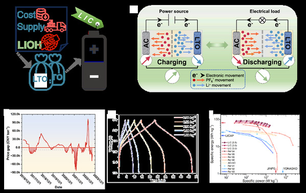 优异的材料和新颖的器件结构是满足日益增长的储能需求的关键因素。锂离子电容器作为非对称超级电容器的一种典型代表,利用电池的高比能量和超级电容器的超大比功率来满足均衡的电化学储能要求。尖晶石型钛酸锂固有的和不可替代的优势使其成为动力电池和锂离子电容器的最佳候选者之一。然而,上游市场的波动,例如原材料价格飙升和供应短缺,极大地威胁到尖晶石型钛酸锂的生产、销售、应用。柔性生产工艺,即使用廉价易得的氢氧化锂水合物来替代价格高且供应紧张的碳酸锂以生产尖晶石型钛酸锂,有助于相关产业在特定市场周期中克服挑战。该研究工作从新的视角报道了自氢氧化锂水合物起始,以高质量的碳酸锂作为中间产物,在羧化后跳过分离步骤,从而实现成本和技术维度更加有效的尖晶石型钛酸锂生产路线。所得尖晶石型钛酸锂的电化学性能优于商业竞争者。所得尖晶石型钛酸锂作为负极材料的锂离子电容器的比能量达到89.5Wh/kg。这些结果表明,寻找技术可行、成本可控、供应链稳定的钛酸锂合成路线以应对周期性市场波动的策略和实践取得了成功。