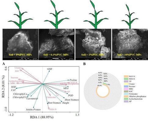 微塑料作为一种新兴的污染物,对生态系统的影响已经引起了全球的关注。然而,微塑料在植物-土壤系统中的作用机制尚不清楚。本文探讨了聚氯乙烯微塑料(PVC-MPs)对玉米幼苗生长和生理特性及土壤特征的影响。结果发现,相比于根系生物量,PVC-MPs对玉米幼苗有更强的毒性效应,玉米幼苗可通过提高叶片超氧化物歧化酶和过氧化氢酶活性来抵御PVC-MPs的影响。随着PVC-MPs添加量的增加,PVC-MPs在土壤颗粒上的附着量、土壤微生物、土壤酶活性及土壤养分含量发生显著改变。其中,土壤硝态氮含量随PVC-MPs添加量的增加显著降低,而在PVC-MPs添加量较低时,土壤铵态氮含量显著增加。冗余分析显示土壤硝态氮可解释玉米幼苗生长和生理特性的87.4%。上述结果表明,尽管玉米幼苗可通过提高抗氧化酶活性及向根系分配更多的生物量来抵抗PVC-MPs的胁迫,而PVC-MPs介导土壤有效氮的损耗是玉米幼苗生长和生理特性的主要限制因素,这将导致农业上作物产量及经济的损失,同时,将加剧农业上过度施用氮肥带来的潜在生态风险。