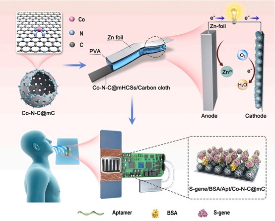 自2019年底至2023年,严重急性呼吸道综合征冠状病毒2(SARS-CoV-2)在全球范围内迅速传播,威胁生命安全并引发了严重的社会与经济问题。课题组开发出一种基于高输出电压的锌空气电池(ZABs)自供电电化学适体传感器,能够高灵敏度和选择性地检测SARS-CoV-2 S基因。由一种新型混合电催化剂——Co-N-C活性位点包裹的空心碳球(mHCSs),简称Co-N-C@mHCSs。这种催化剂具有稳定且均匀分布的活性位点和优异的催化性能,可作为组装柔性ZAB的阴极催化剂和固定SARS-CoV-2 S基因靶向适体的生物平台。该自供电电化学适体传感器对SARS-CoV-2 S基因的检测范围为1 fg/mL至10 ng/mL,最低检测限(LOD)可达0.35 fg/mL,并且具有其他优异的传感性能。改进后的ZAB具有较高的输出功率密度,并可通过手机读取响应,使得ZAB-SPA在原位检测S基因方面具有实际应用价值。通过更换生物探针,该研究为在移动人群中检测流行病提出了一种新的自供电适体传感方法。