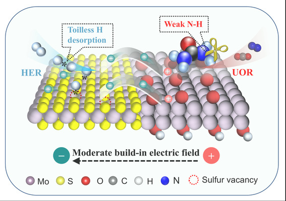 构建内置电场是优化反应中间体吸附、反应和脱附的有效策略,但其精确调控以实现高效双功能电催化反应仍极具挑战。基于此,团队通过精准调制钼基同源异质结材料的阴离子空位,构筑了具有可调内置电场的中空Mo/MoSVn纳米反应器,优化了析氢反应(HER)过程中氢解吸和尿素氧化反应(UOR)过程中N–H键能,提升了析氢反应和尿素氧化反应,实现了尿素耦合节能制氢。其中,具有适中内置电场强度的纳米反应器表现出最优的双功能催化活性和稳定性;同时,组装的HER||UOR耦合制氢系统比常规系统的析氢过电位低437 mV(100 mA cm-2),可在200 mA cm-2工作条件下稳定运行200小时以上。系统的生命周期评价结果证实了纳米反应器用于耦合制氢在降低碳足迹、保护生态环境、减少可再生/不可再生能源消耗方面的独特优势。