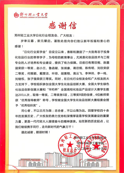 信中表示,“日化行业奖学金”自设立以来,表彰和激励了一大批有志于投身化妆品行业的莘莘学子,为母校的教育事业,尤其是化妆品技术与工程专业的人才培养和专业建设提供了有力保障。同时,在日化行业校友会和广大校友的大力支持下,学校组织参加全国大学生化妆品创新大赛、全国大学生绿色化妆品创新创意大赛和“华灼杯”全国高校化妆品产品设计大赛学生数达203人次,取得一等奖、二等奖各5项,三等奖9项的佳绩,6位教师荣获“优秀指导教师”称号,学校被全国大学生化妆品创新大赛组委会授予“优秀组织奖”。