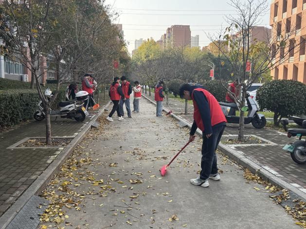 活动伊始,志愿者们携带扫帚、垃圾夹、分类垃圾桶、抹布等工具在樱花校友林集合,在工作人员的统筹部署下明确分工、迅速行动。大家分为路面清扫组、杂物捡拾组、树牌养护组三组协同作战:路面清扫组细致清理林荫小径上的落叶与碎石,确保路面整洁通畅;杂物捡拾组俯身穿梭于草丛间,逐一拾起隐藏的纸屑、塑料瓶等生活垃圾,不放过任何卫生死角;树牌养护组用抹布轻轻擦拭刻有历届校友班级、姓名的树牌,去除表面尘埃,让字迹重新清晰可辨。初冬微寒,但志愿者们热情高涨、默契配合,使得校友林整体环境焕然一新,成为冬日校园中一道温馨的风景线。