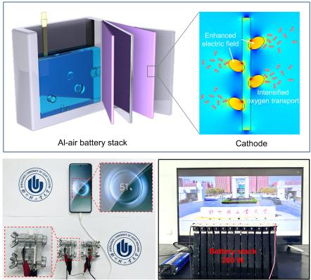 该研究聚焦单原子催化剂在金属空气电池应用中氧气传输效率低的关键瓶颈问题,通过调控MnO2载体晶面,成功增强局域电场并优化活性位点配位微环境,显著降低空气阴极氧气传输阻力,提高Pt单原子浸出能垒,从而大幅提升氧还原反应活性和稳定性,实现铝-空气电池的高效稳定运行。实验数据显示,采用B-Pt1/MnO2催化剂的电池能量密度高达3690.6 Wh kg-1,在50 mA cm-2电流密度下表现出优异稳定性,性能优于目前已报道的同类催化剂。基于该催化剂的实验室电池可稳定为手机充电,组装的铝空气电堆能量密度达到480.2 Wh kg-1,接近美国能源部对动力电池的技术要求,并可稳定驱动180瓦电视工作。技术经济分析表明,该系统的成本仅为已报道铝空气电池的1/50,展现出在可持续能源领域的广阔应用前景。