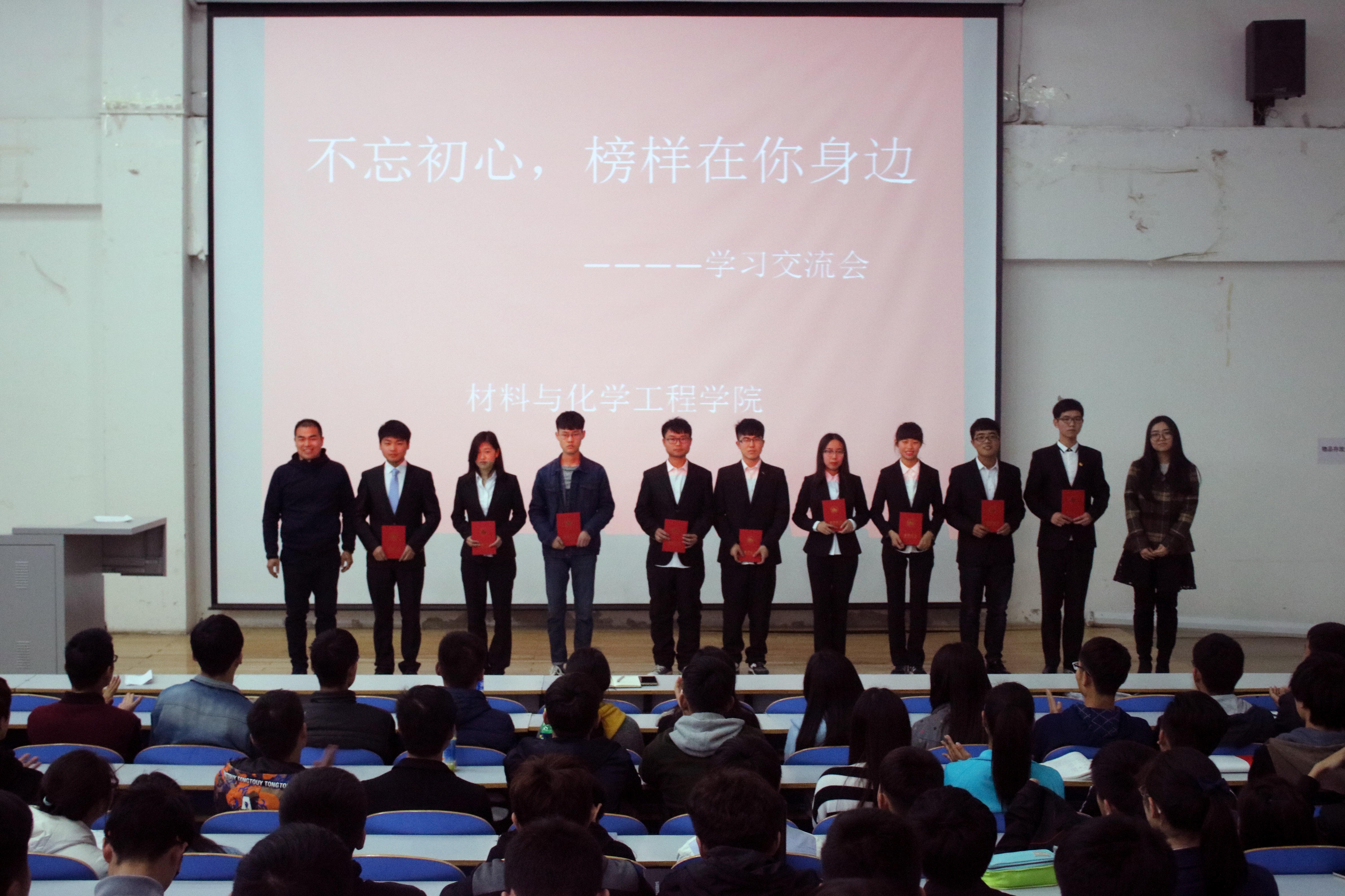 在主持人的简单开场后,朱老师首先上台致辞,讲述了本次活动的目的和意义。王老师在随后的发言中指出,她希望同学们在这次活动中有所得,有所学。接着,9位“学霸”依次为同学们分享了他们的学习方法和技巧,这九名同学平均学分绩点均在3.8以上,都是班级公认的学习“达人”。其中,王欣然同学的“心若在,理想之路就不远”;翟宁辉同学的“生命不息,奋斗不止”让同学们感触颇深,赢得了阵阵掌声;新材器16-01班的孙明辉同学介绍了他的大学生活所获,他提出要有正确的生活态度和端正的学习态度才能使自己劳逸结合。九名优秀的同学给大家分享自己的学习生活经验。在交流过程中,发言的同学以朴实却不失精妙的语言将自己的学习方法毫无保留地与同学们分享,使在场的同学获益匪浅。之后两位老师为优秀学生颁发奖状并合影留念。最后,由朱老师对活动进行总结,并指出学习要有恒心、有目标、有规划、立长志,对同学们给予更高的期望。