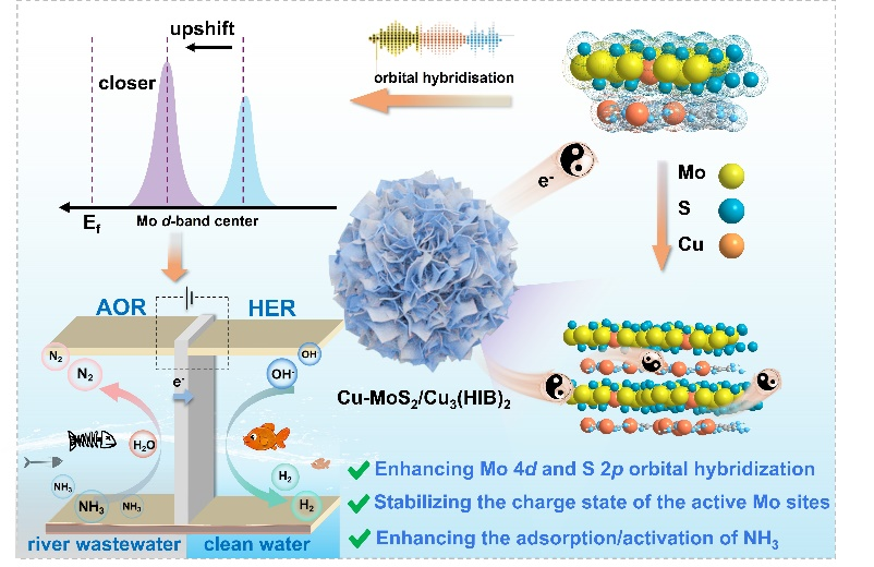 氨作为重要化工原料,在医药、食品、农业领域应用广泛,还是潜在氢载体,但易随废水排放,因高水溶性危害环境与人体健康。电催化氨氧化反应(eAOR)是关键去除手段,不仅能将氨转化为无污染的氮气和水,还可替代高过电位、慢动力学的析氧反应,与析氢反应结合加速产氢,兼具环保与能源价值。针对电催化氨氧化反应困境,利用界面电子调控工程制备出新型2D/2D Cu-MoS₂/Cu₃(HIB)₂异质结电催化剂,该催化剂可显著促进电子转移并调控活性位点反应性,具备高效的eAOR与析氢反应性能。所组装的电解装置在相对于可逆氢电极1.60 V的电压下,实现了约100%的氨去除率,产氢速率达15.3 mL/h,为同步实现废水处理与绿色制氢提供了一条可持续途径。
